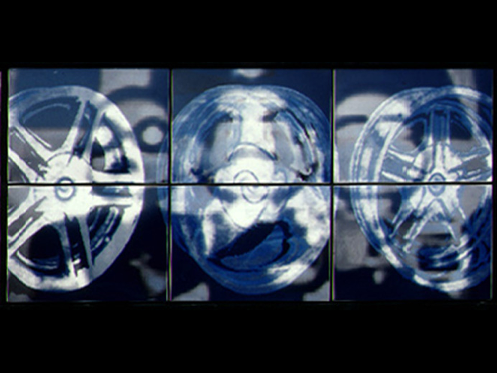 Six colorful porcelain-on-steel panels illustrate a contemporary view of design and automobile accessorizing in popular Los Angeles culture. The imagery is drawn from a series, Auto Malapropos, specifically utilizing the wheel and hub cap elements of contemporary vehicles. In the Auto Malapropos Series, the hub cap illustrates a hyper-specific segment of in-culturalization of the automobile.