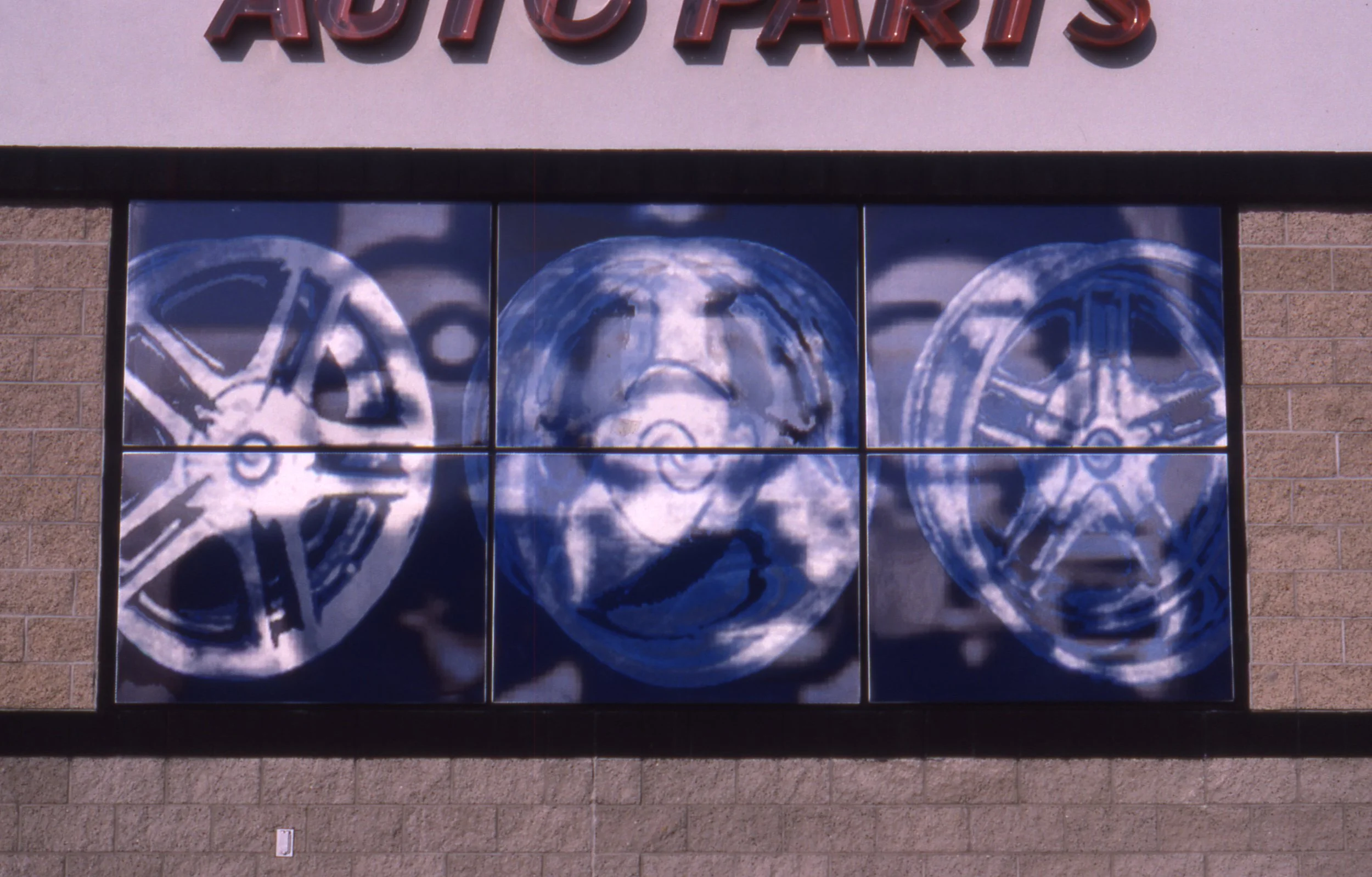 In “After Market Wheel,” the artwork echoes the City of Culver City’s history and contributions to California’s rich car culture. The 18’ x 8’ piece is baked porcelain enamel on metal in six panels, employing a window motif on the Pep Boys storefront.