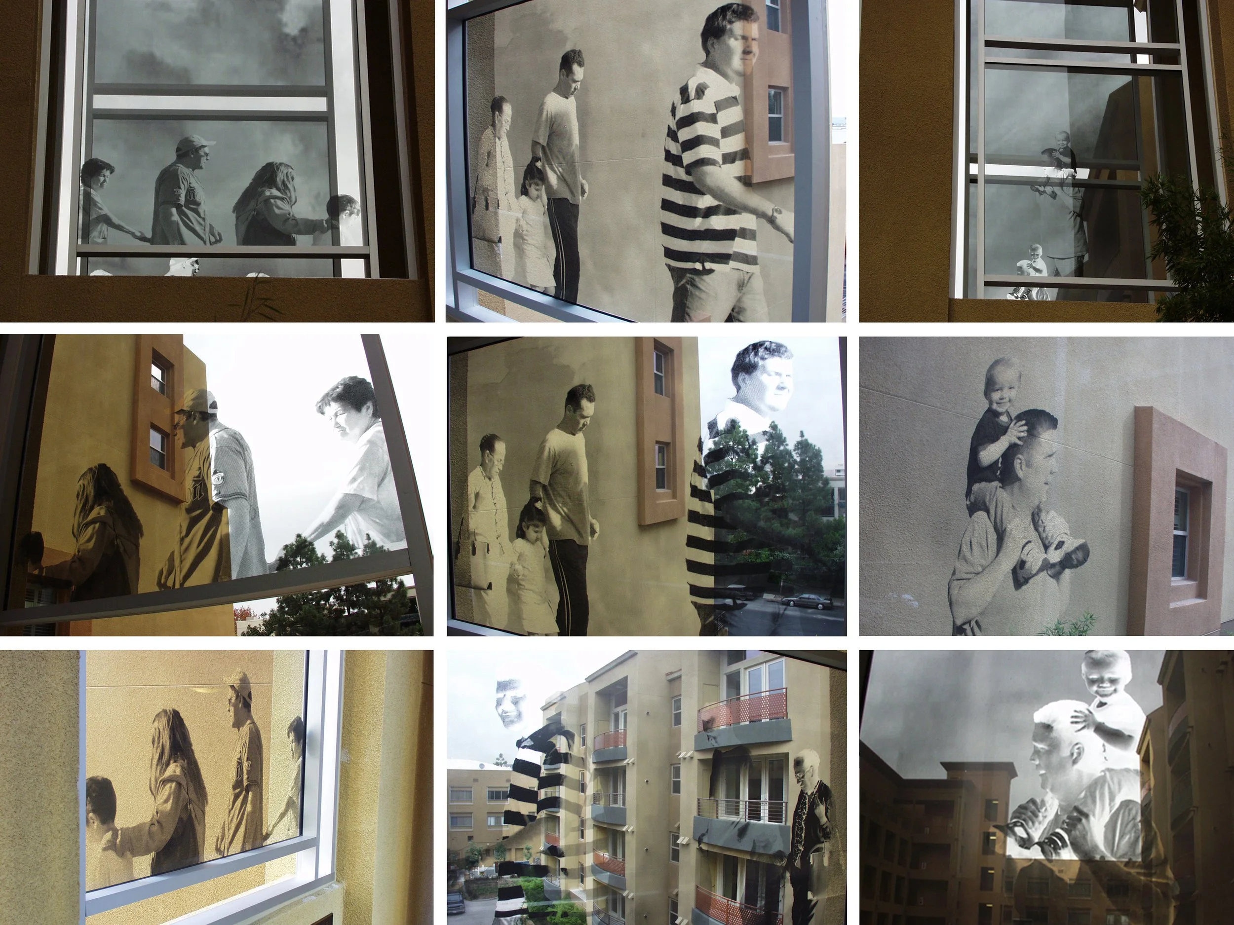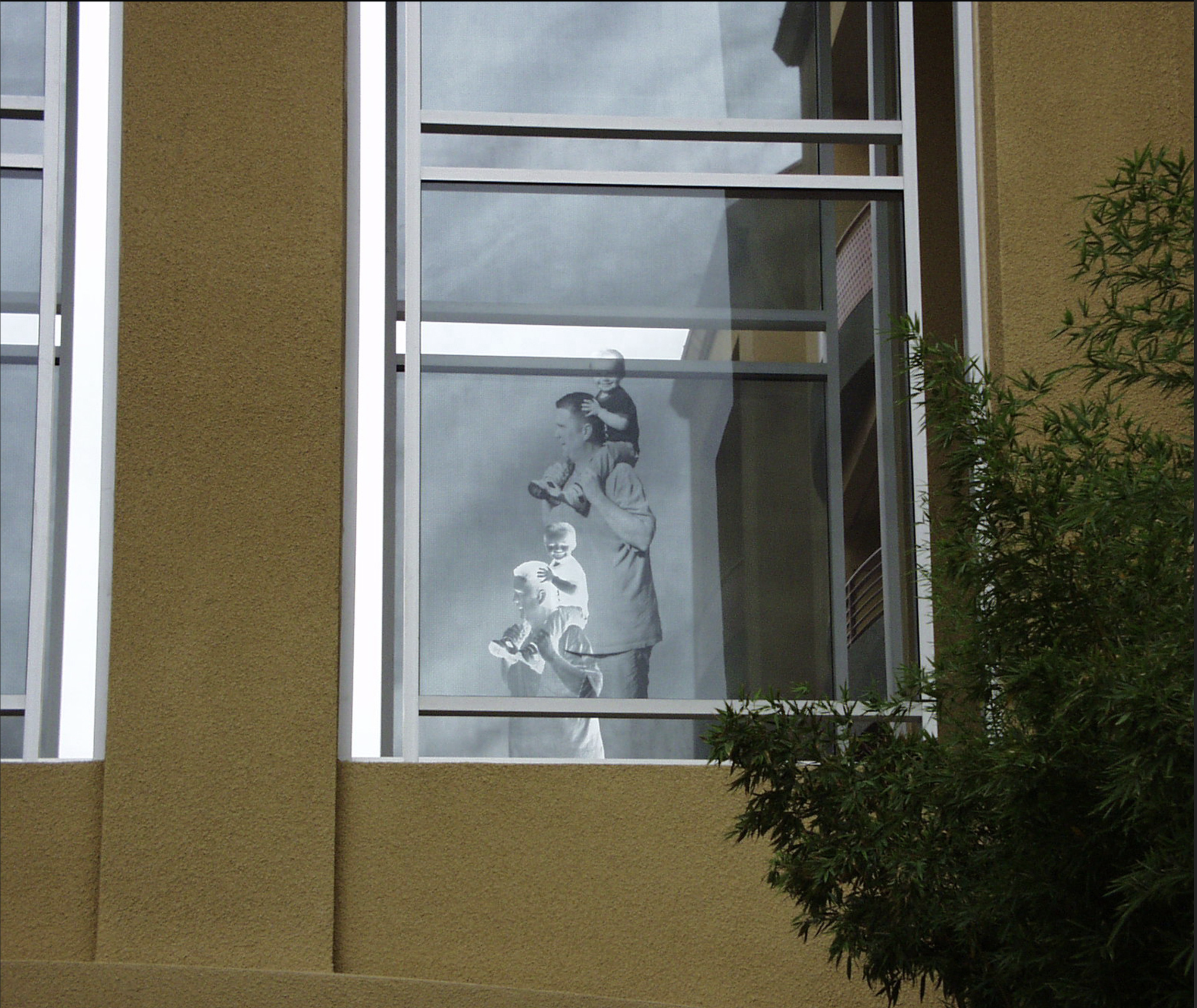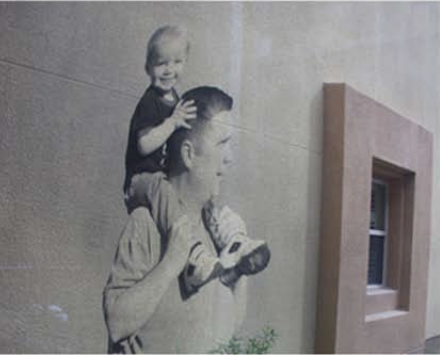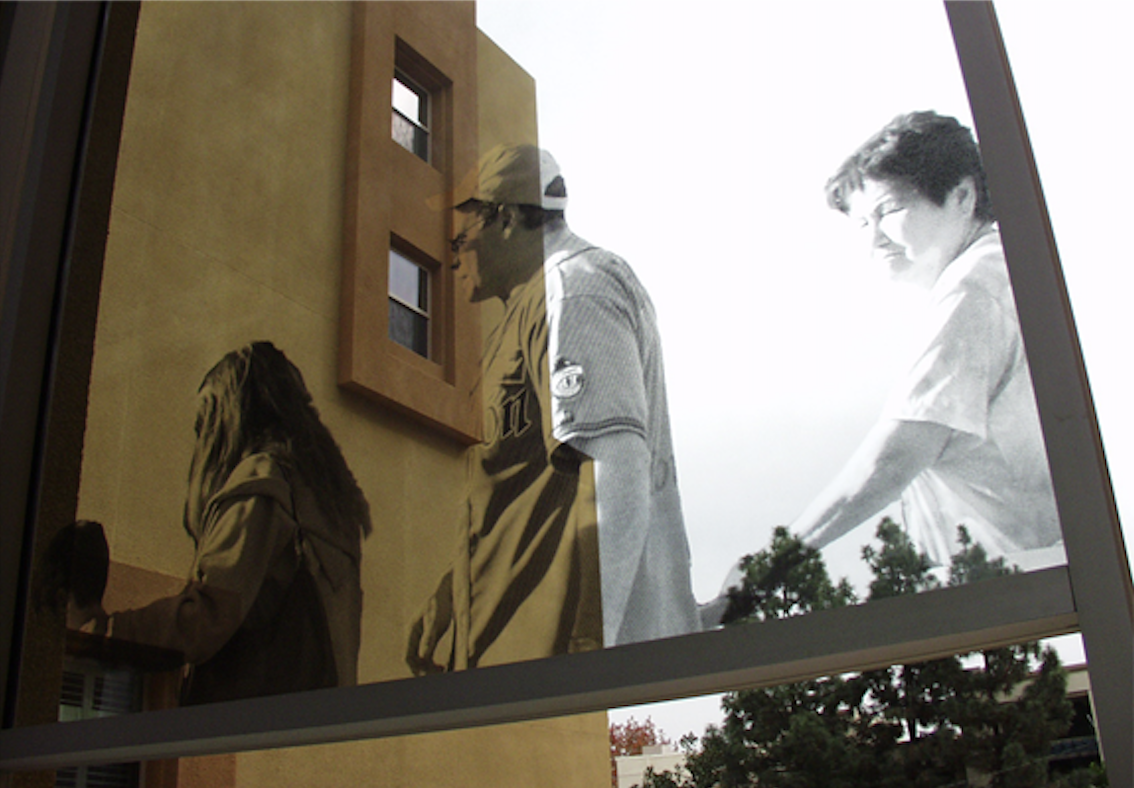 A tile monument and bench feature visually illustrates aspects of directionality and time relative to its conspicuous transportation context.