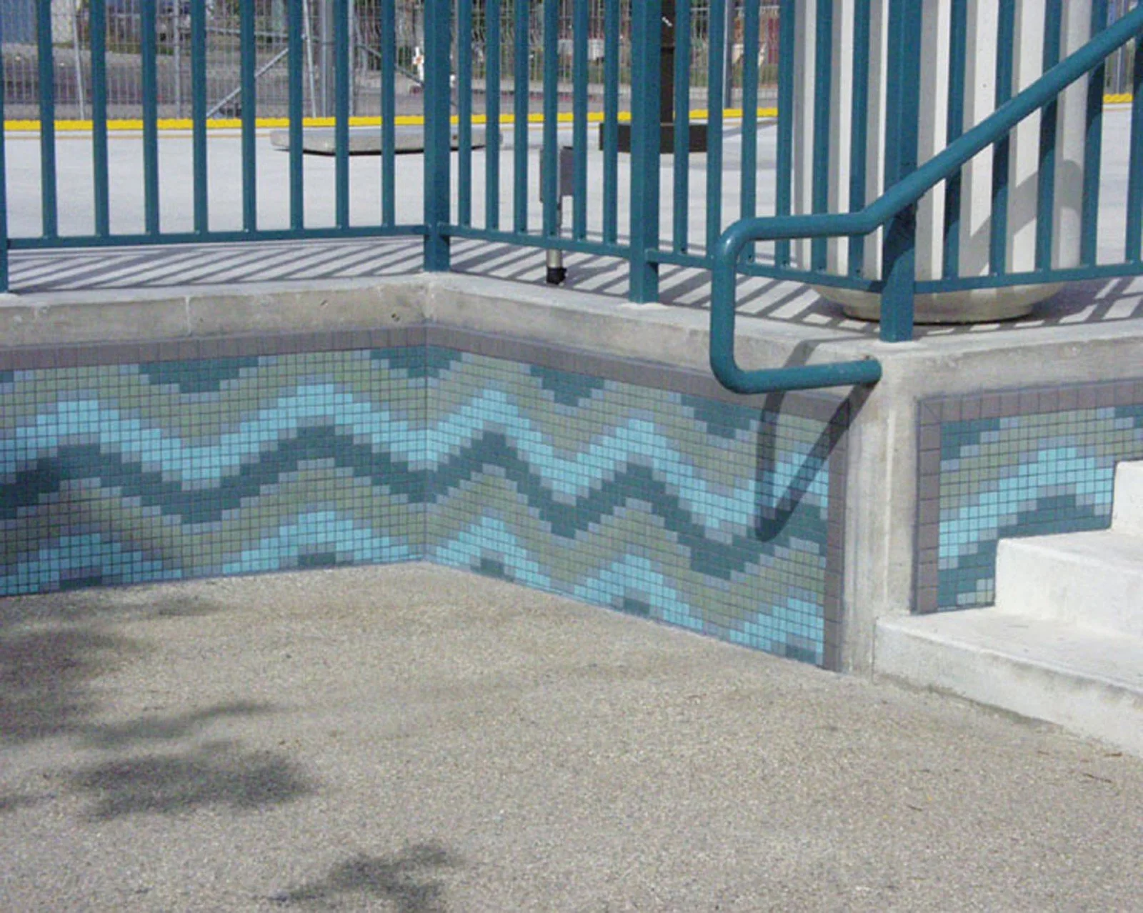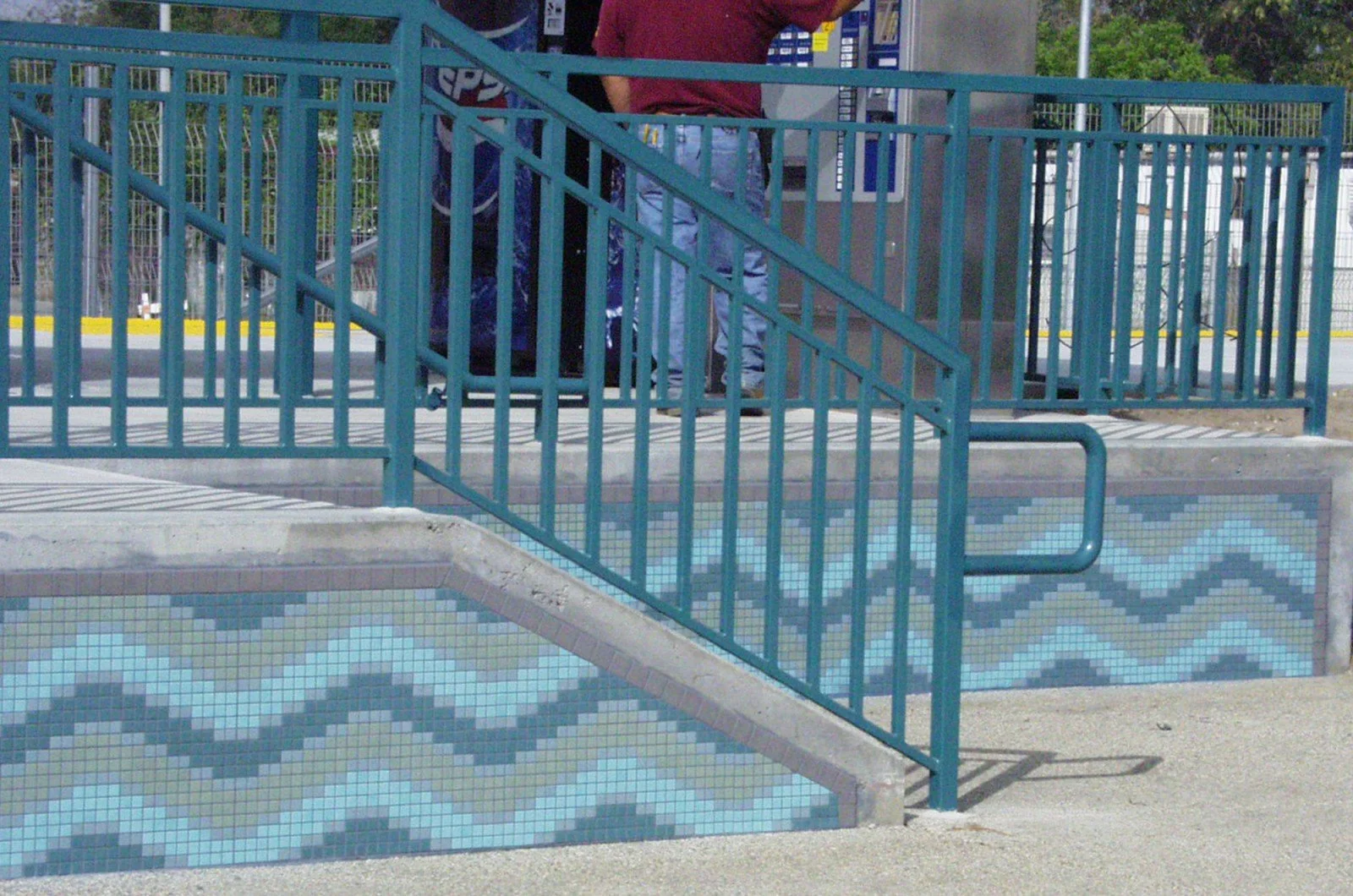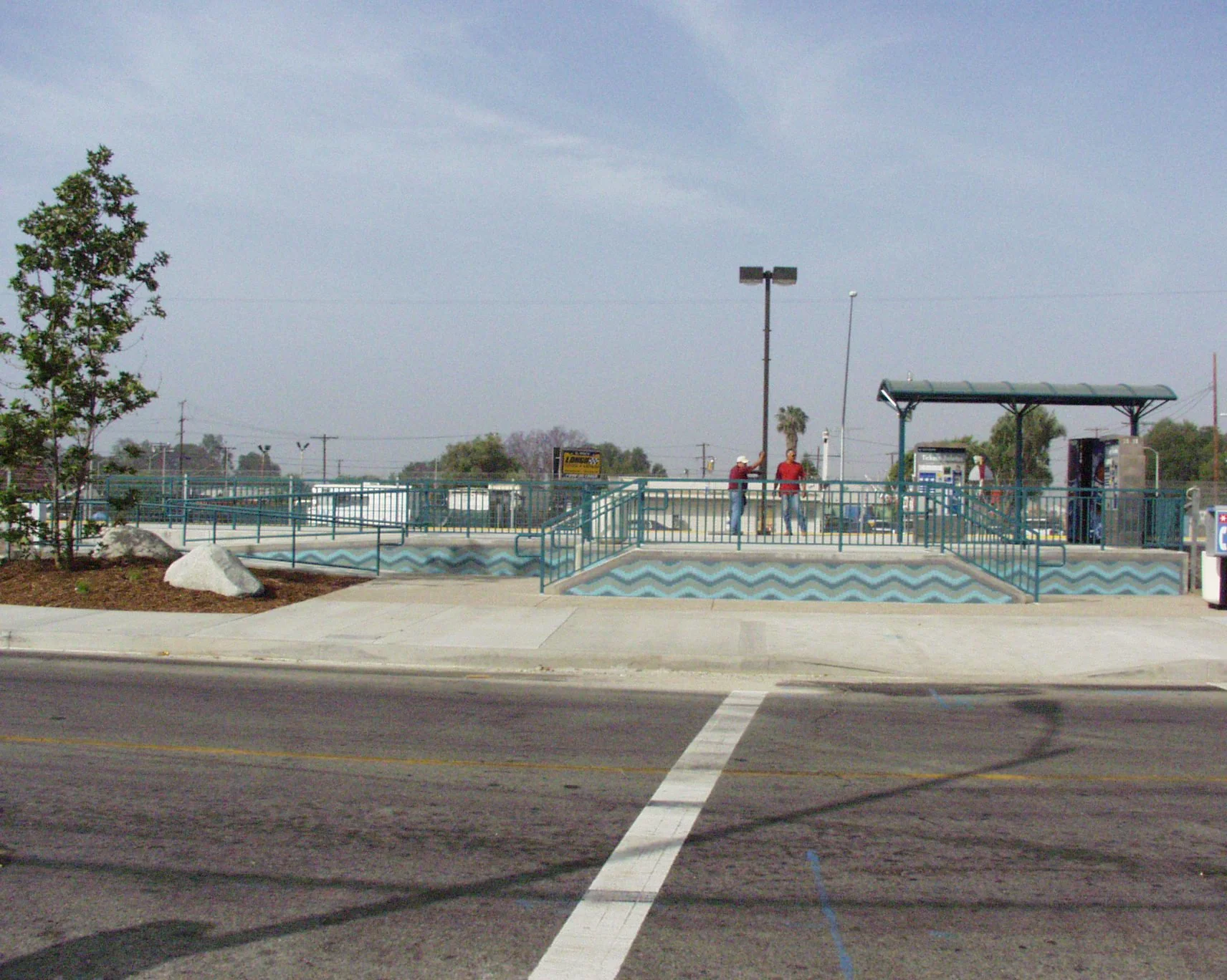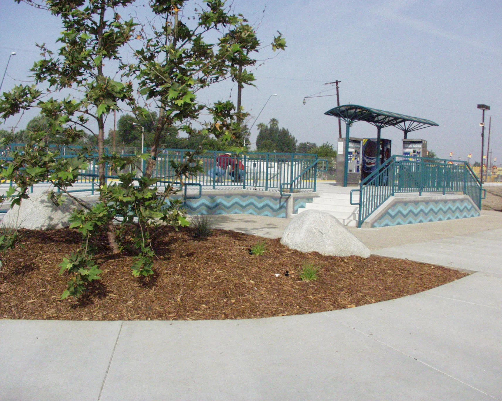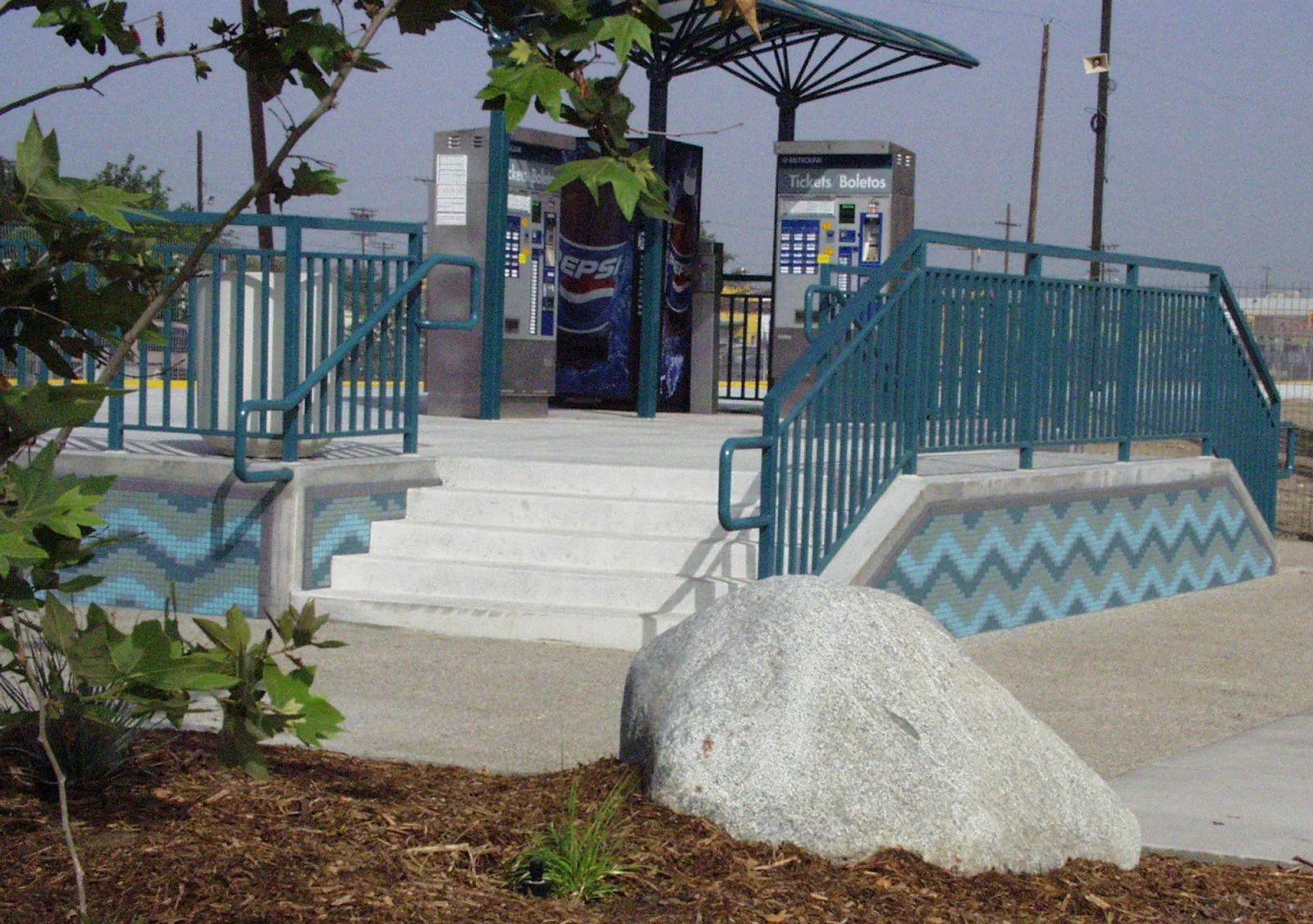 An arroyo design incorporating mosaic tile mural illustrates movement and water. The MetroLink site features landscape and hardscape, employing serpentine walkways, boulders and arroyo native plantings.