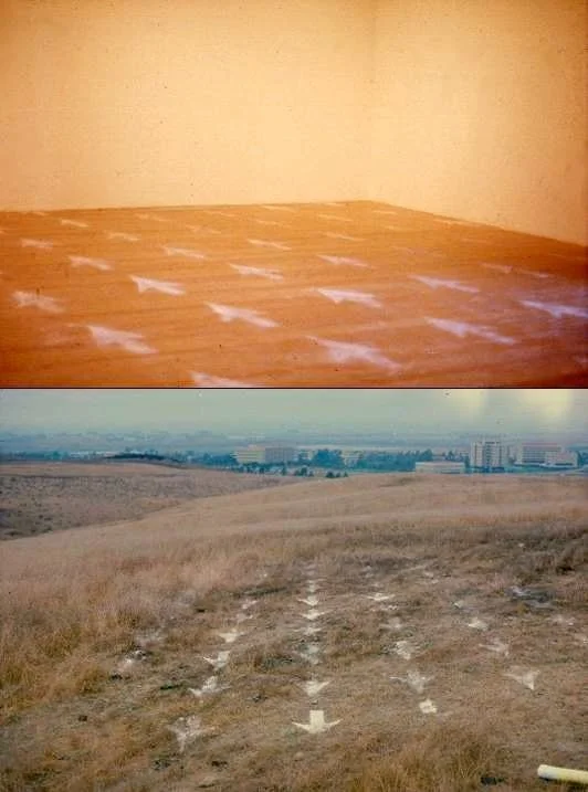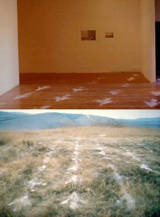 Artist infused a gallery space with a visual field of arrows. He sensed the direction the arrows pointed as a place from which to start his investigation, thus the field was to illustrate a perceived direction. This direction was then documented and transposed to US Geological quadrangles, to locate position and direction relative to normal declinations. His perceived direction coincided with USGS grid "North," as described in project text. Direction was followed and documented by artist, eventually revealing an adjacent hillside clearing, the exact size of the gallery (see publication), which subsequently was dusted with same arrow pattern, uniting both sites and drawing conceptual illusions (see publication).