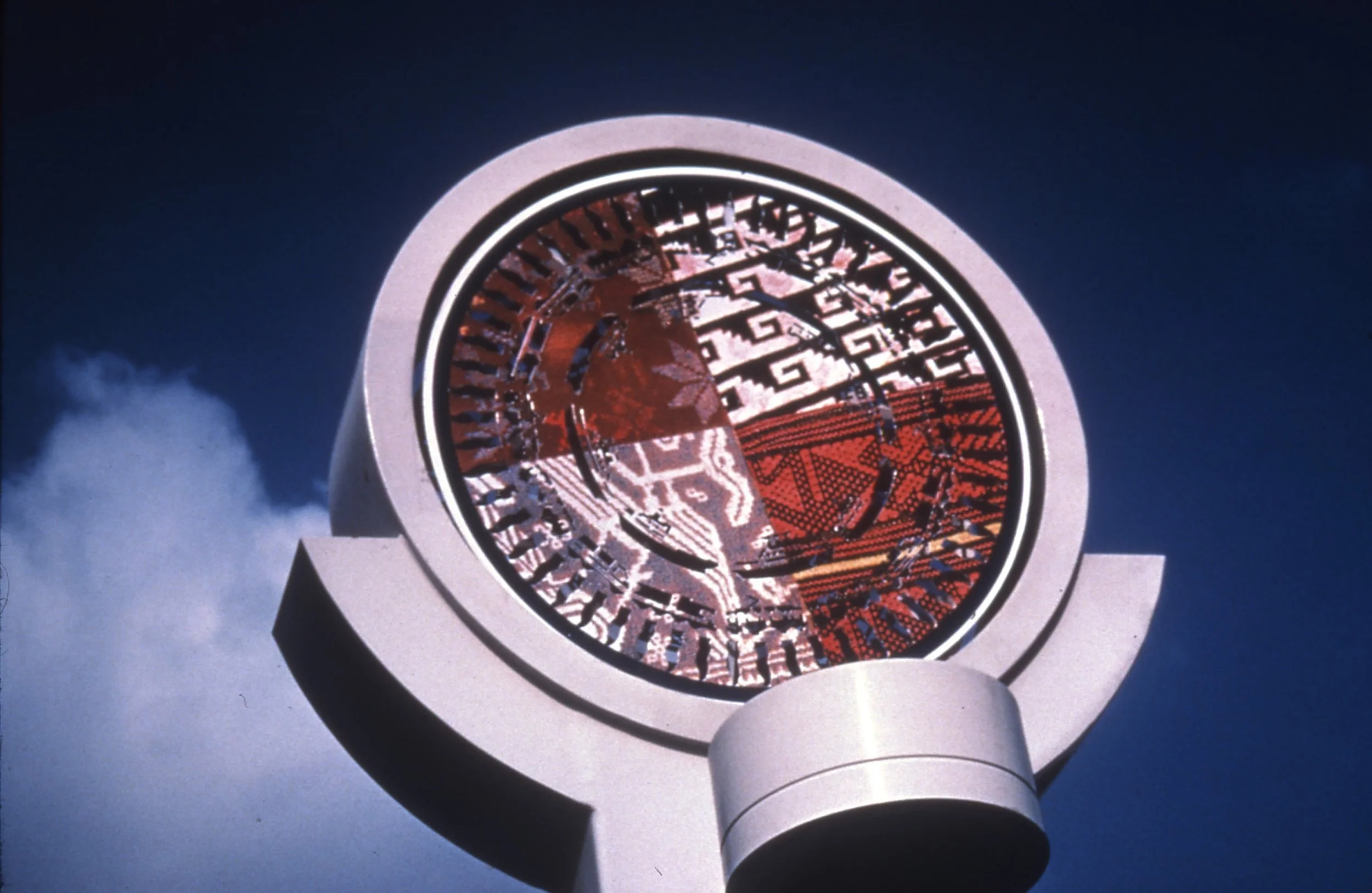 These are twelve wind-driven, kinetic counter-rotating disks, mounted on six fourteen-foot metal pylons. Each disk exhibits a unique, colorful, baked porcelain decorative element. These elements are samples of the ethnic diversity of the community, illustrated by each ethnicity's graphic fabric pattern. Being wind-driven, the disks rotate and are perforated so that light and color pass through each disk, the images constantly changing, flickering, and entertaining passers-by.