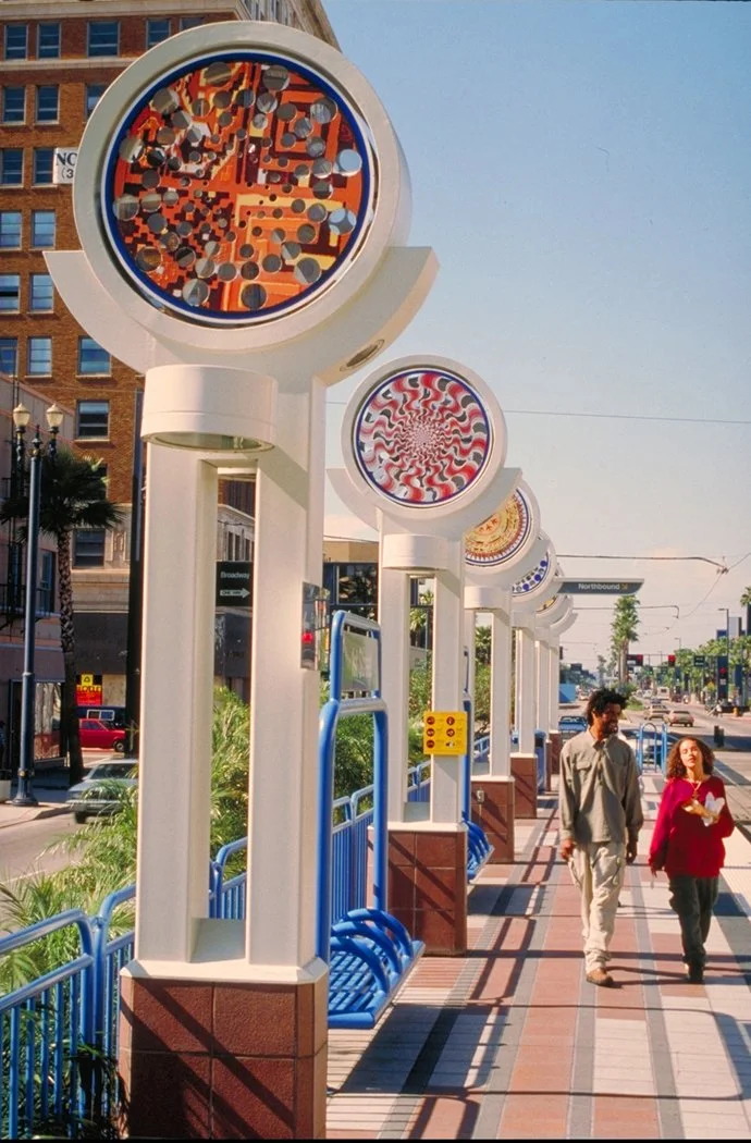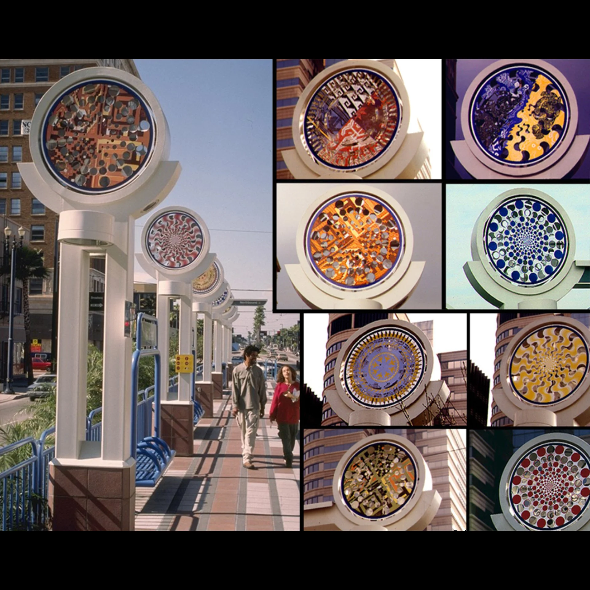 These disks have been colorfully enameled with both patterns of fabrics and symbolic elements relating to Long Beach's history, specifically highlighting its relationship to modes of transportation. Also, each disk has been perforated with these graphic patterns to allow them to spin in a breeze as well as contribute to the play of light through the disks against the sky, and shadow play on the Metro platform. These colorful disks are meant to rotate in the wind and constantly change, entertaining both passengers and passersby.