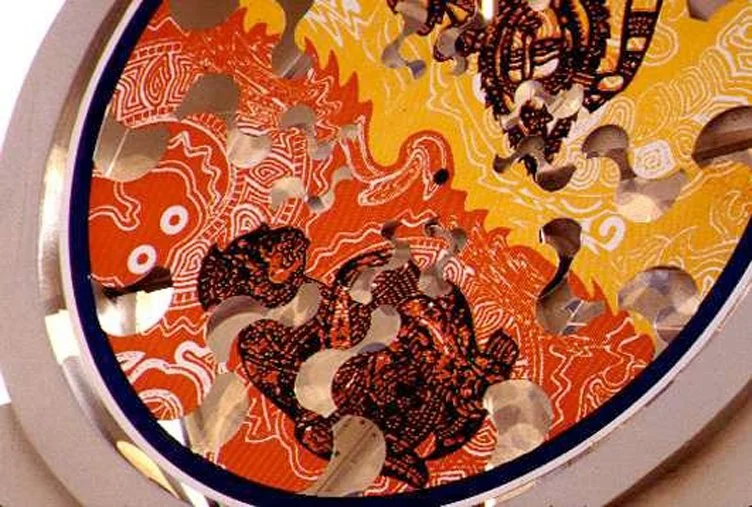 The many designs I employed ranged from patterns taken from Cambodian shadow puppets to modern graphic geometry which were then transformed into rotating, wind-driven kinetic sculptures and mounted in the pylons on the station platform. Each sculpture consists of a pair of counter-rotating disks which are set in motion by the daily sea breeze.