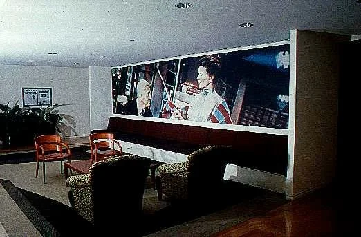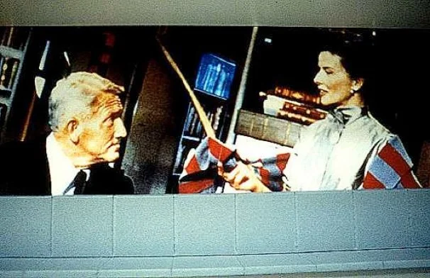 A mural-sized digital print illustrating a scene from the movie "Desk Set" whose plot dealt with early use of computer technology. The scene features Spencer Tracy and Katherine Hepburn facing each other, with an insertion of a television monitor that is functional, showing ongoing programming. The monitor is imbedded so as to become a part of the wall installation, incorporated in the composition.