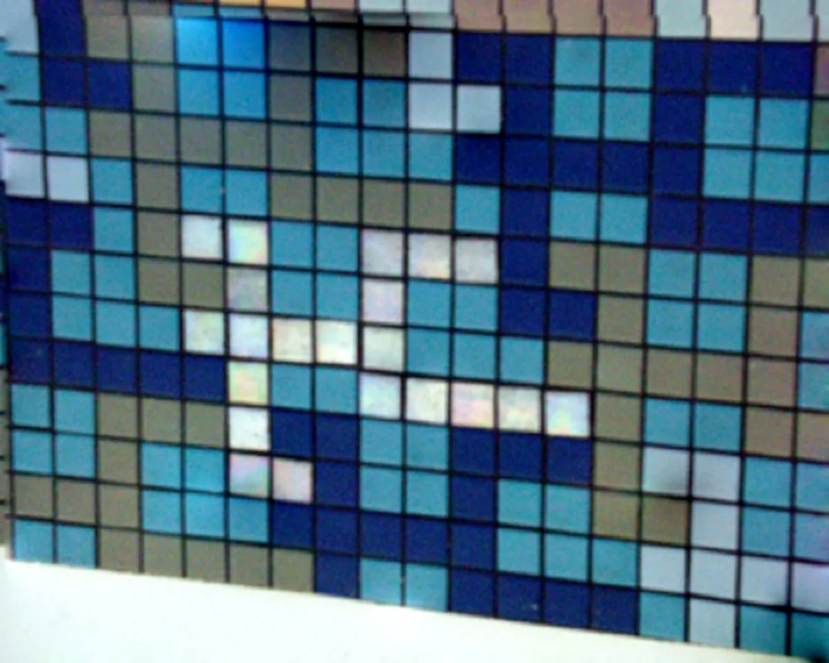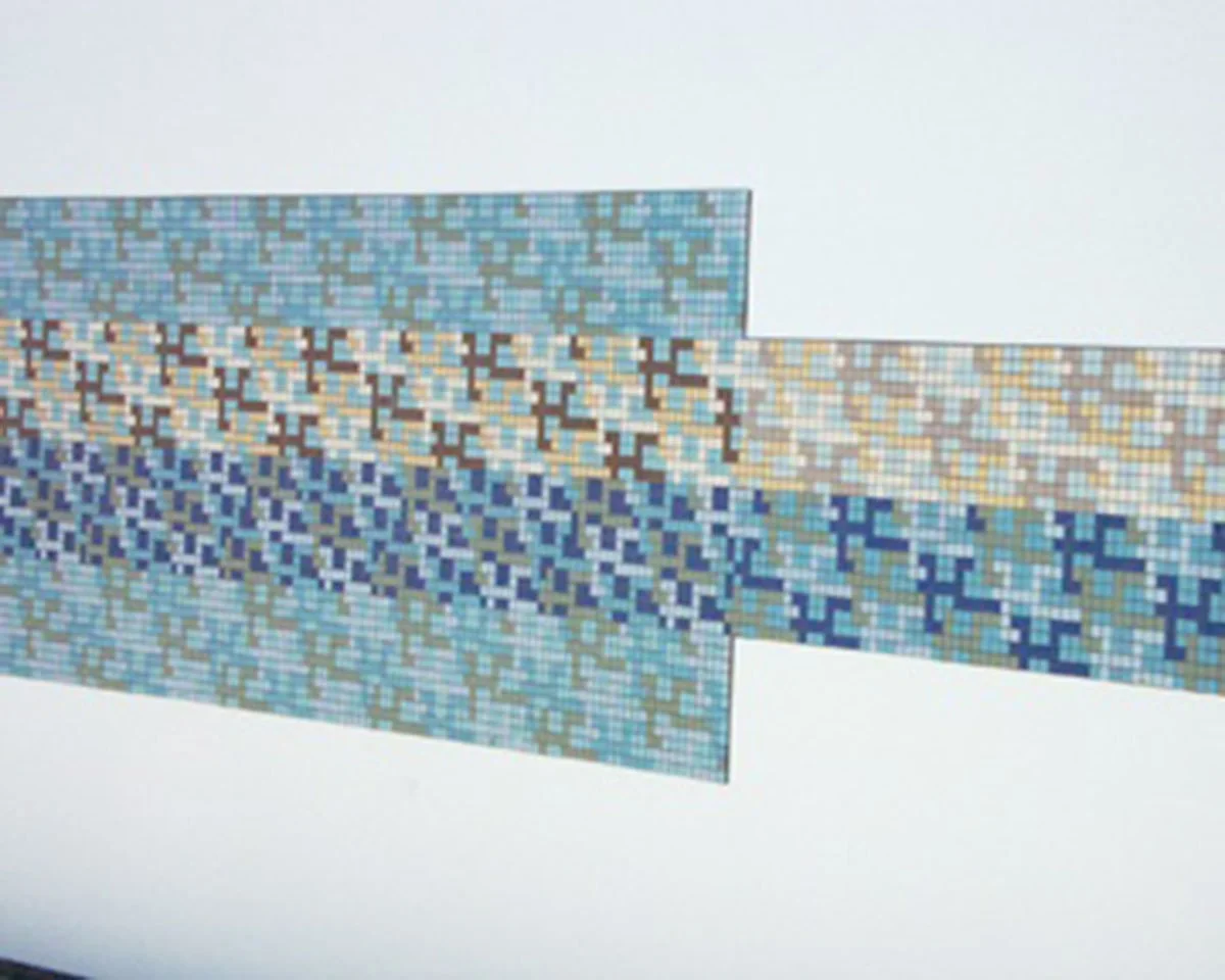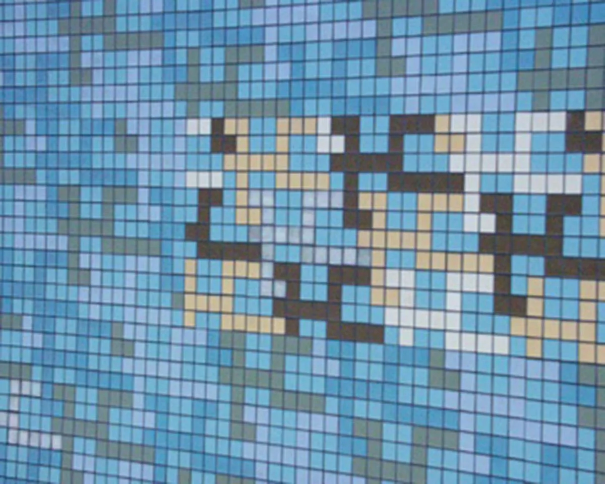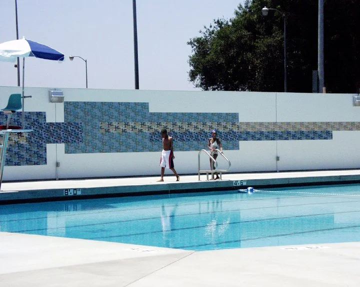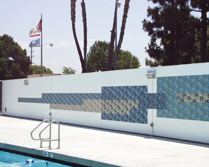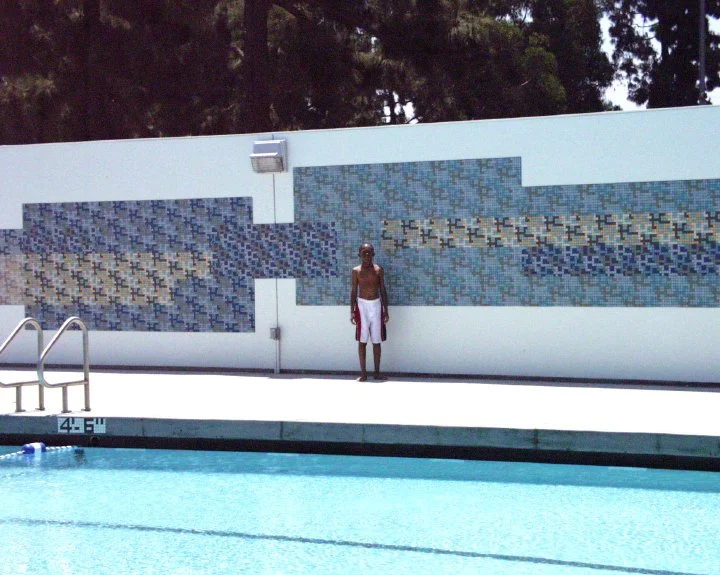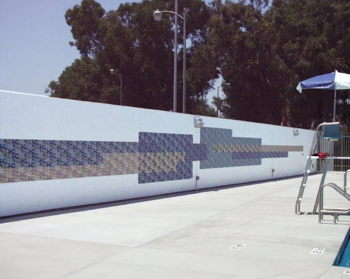 The mural "Different Strokes" is applied to a 120' wall adjacent to a public swimming pool at Mary Bethune Park. The swimming motif echoes the diversity of the community and the complexity of the relationship between man and water. In a 1-foot by 2-foot visual module, the swimming motif repeats to infinity, consisting of six color motifs utilizing the same tile pattern.