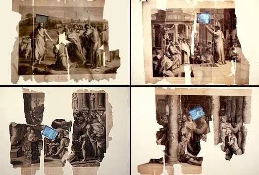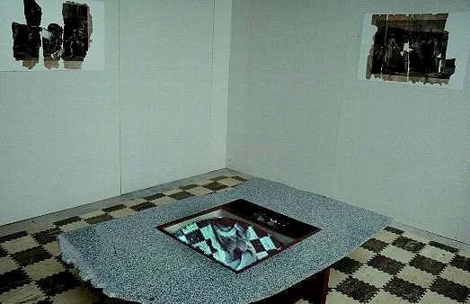 "For Profits / Four Prophets, " an inter-active installation incorporating central closed-circuit monitor (embedded in granite table in shape of United States) depicting live "feed" of spinning Scheherazade character with soundtrack and four antiquated Raphael lithographs with one 4" B&W monitor embedded in the surface of each. Linoleum puzzle floor, duo-tone tan and brown. As viewer enters piece, one sees four lithographs, one embedded in each of four walls, and central is a monitor/table. Video and audio feeds change from lithograph to lithograph, clockwise, as a central figure in monitor table spins to face lithograph. As central character spins, she recites tales from the Arabian Nights. Conceptual structure of piece pivots on feminist disposition relative to contemporary geo-social architecture and its depiction in art historical context.