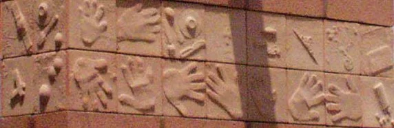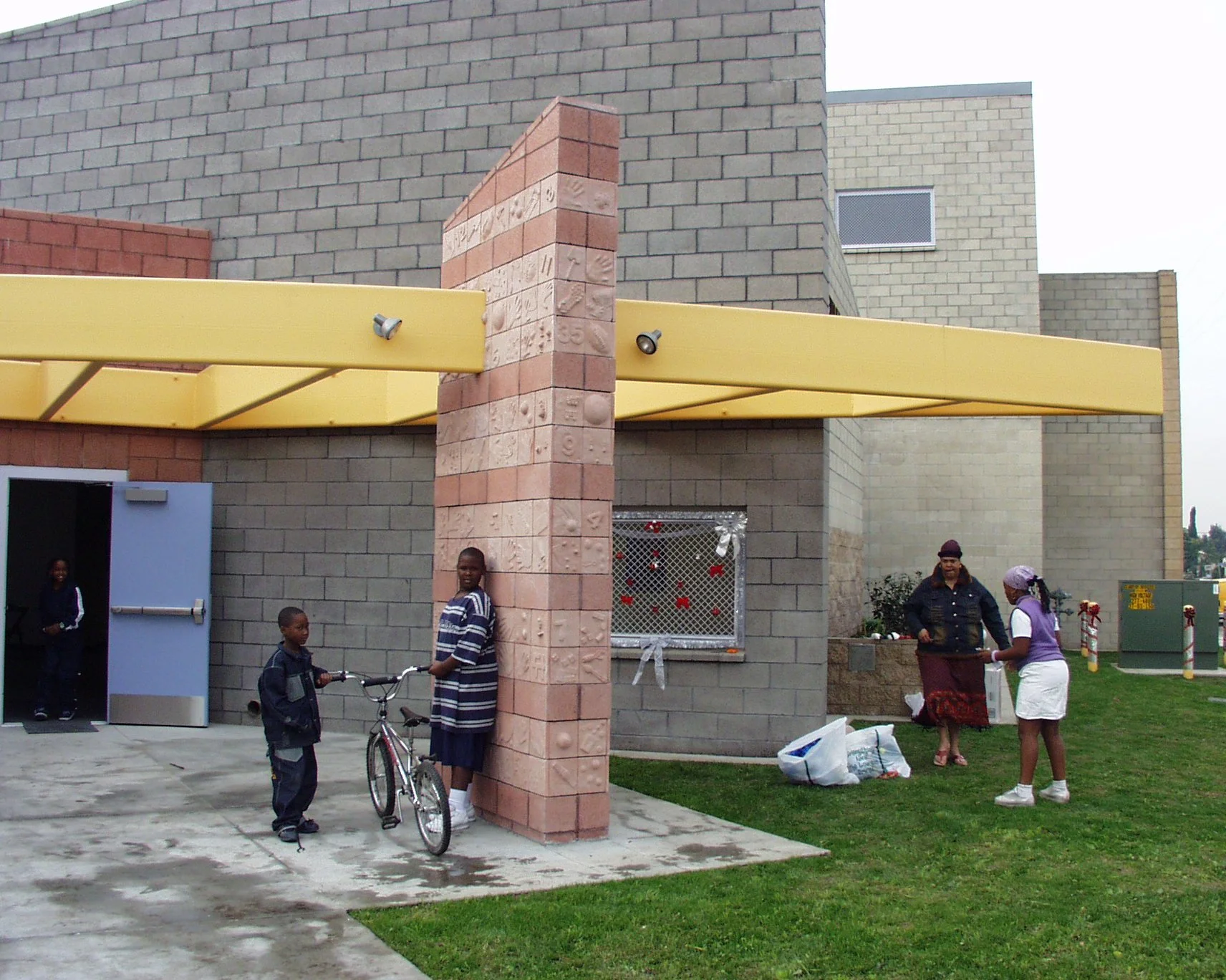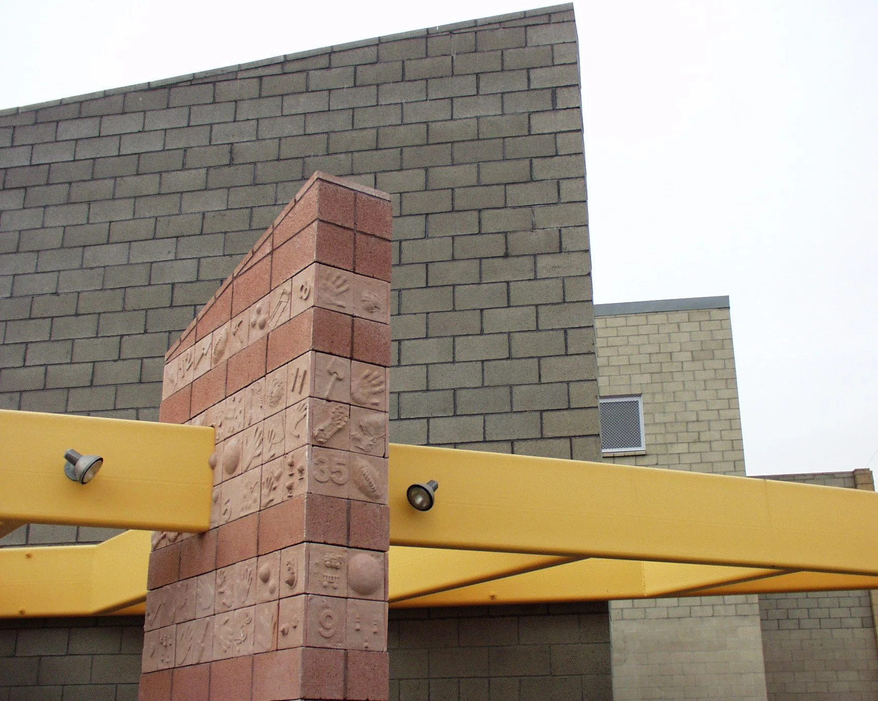An architecturally integrated column composed of 8" x 8" sand-cast cement tiles, produced by interactive community programming. The community was invited to have a “hands on” experience with the site and work (as the title implies). Community participants provided their hand prints, objects and their names. The objects they provided were solicited by the artist to bring a personal and familial connection to the site. Each family was asked to provide an object that meant something specific to their family unit. Along with hand prints, the objects were gathered and compiled in the artist’s studio, where they were individually set in sand and cast, one by one, in concrete, as tiles. These tiles were installed and composed on site. The interplay between light and shadow was the driving aesthetic to the composition. The artist found it was a pleasure working with the community and finding out more about them in the process.