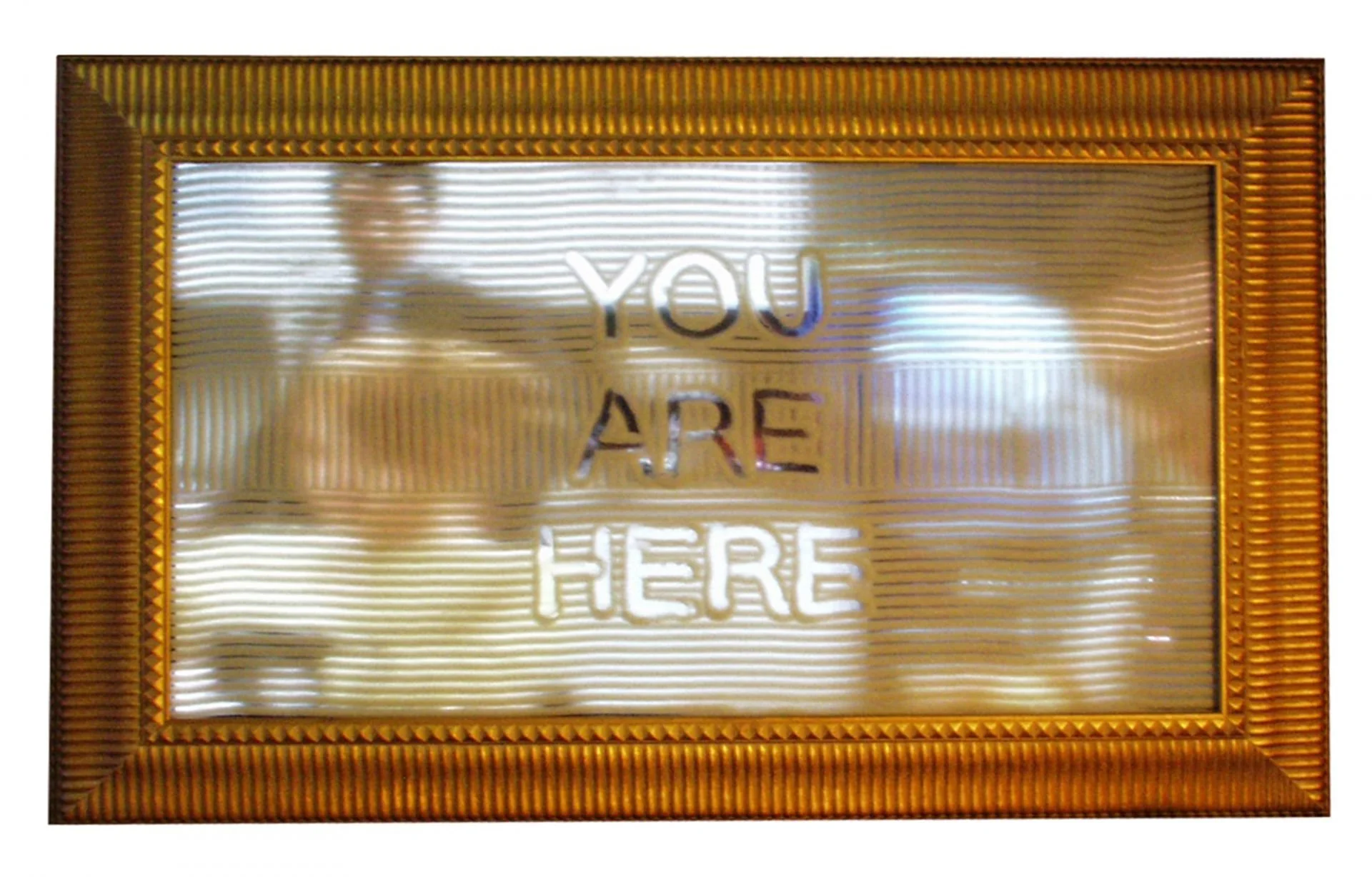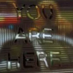 Karesansui nobedan is the Japanese zen garden art of raked gravel emulating water ripples or waves. This freeform garden art has been transposed onto a closed circuit video image, with translucent raked glass waves interacting with the live images. Millions of minute glass beads act as the gravel and create a visual plane similar to a sandy beach where one might write his or her name or see his/her footprints. In this case, the reminder motif, “You Are Here” again focuses attention on the now.