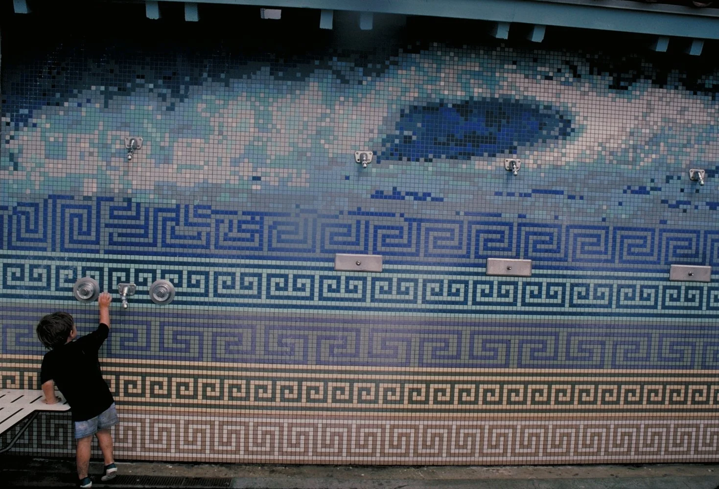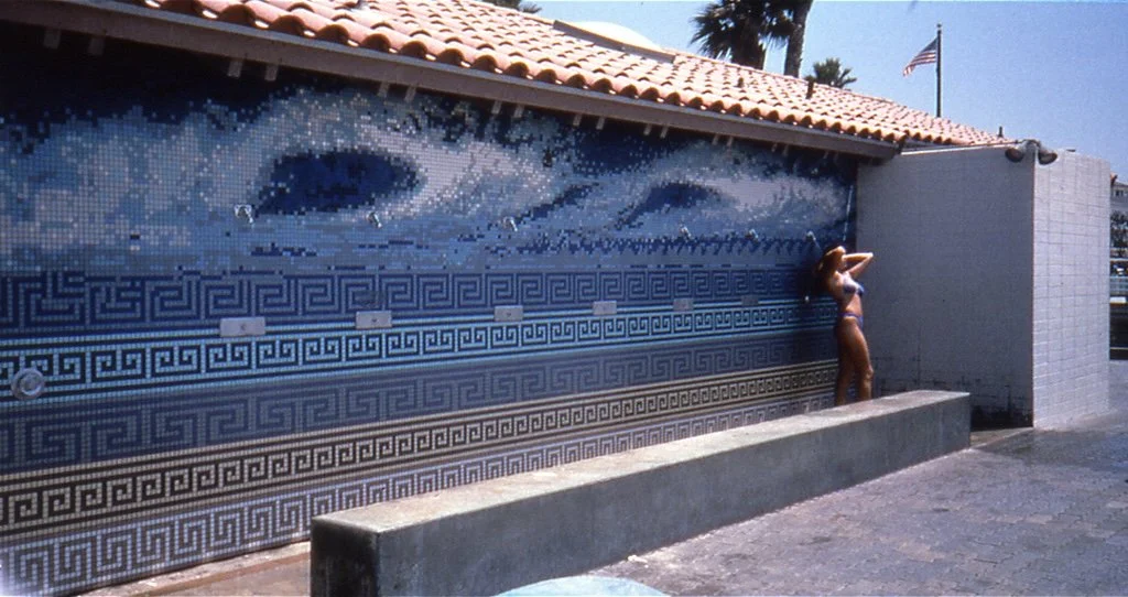 A mural covering the outdoor public Comfort Station (showers) located at the pier on Manhattan Beach. The mural features five distinct "keys" from various cultures, each representing earth and water, and a large wave motif, all in one-inch porcelain tile.