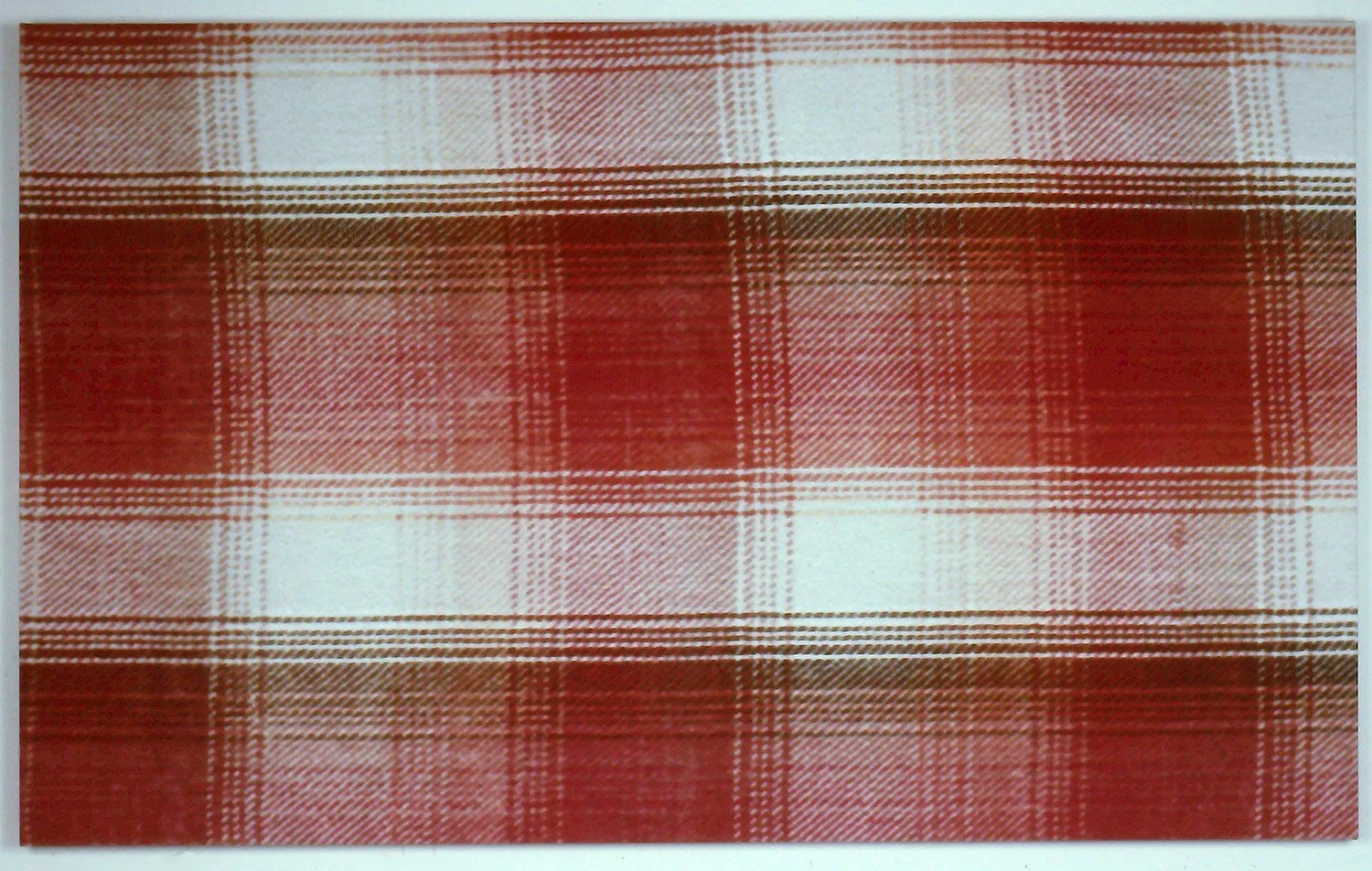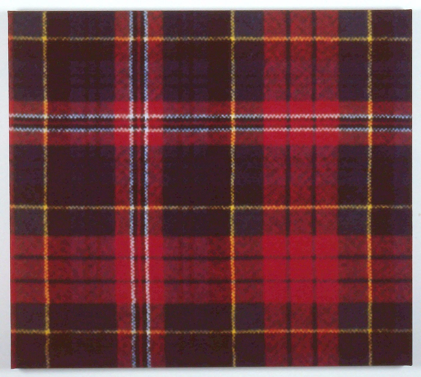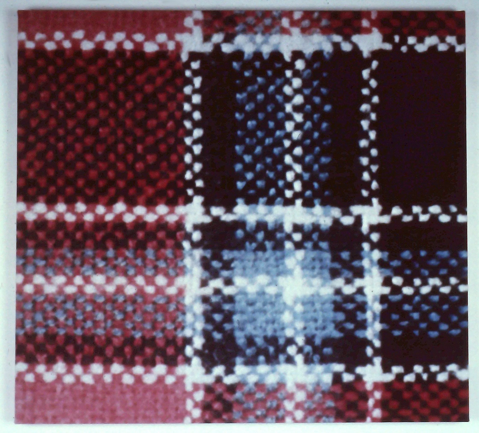 Large-scale analog computer output of four-gun air brush process, real time print manipulation renderings. Each raw canvas reveals a woven texture beneath the plaid and tartan large-scale visual weaving, illustrating the analog encoding of information through the loom to contemporary digital contexts.