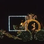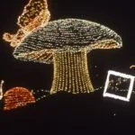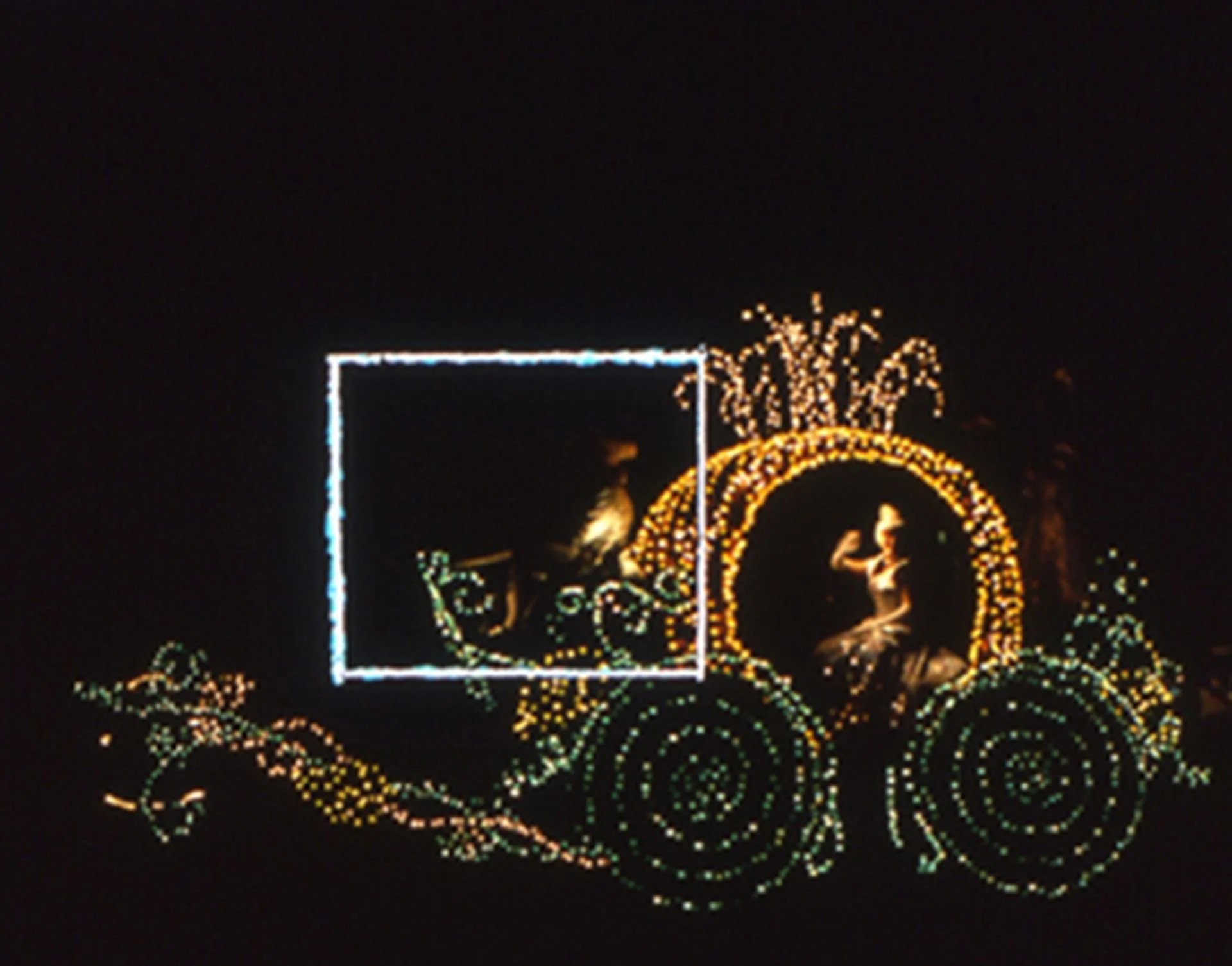 “The Pumpkin Coach” (Emulsion Series) from the Cinderella Unit of Disneyland’s Main Street Electrical Parade, and “Mushroom With Butterfly and Ladybug” (Emulsion Series) from the Alice in Wonderland Unit, are part of a site-specific photographic narrative at Disneyland, California. The etched box in the photograph provides a luminescent border overlay on an existing context.
