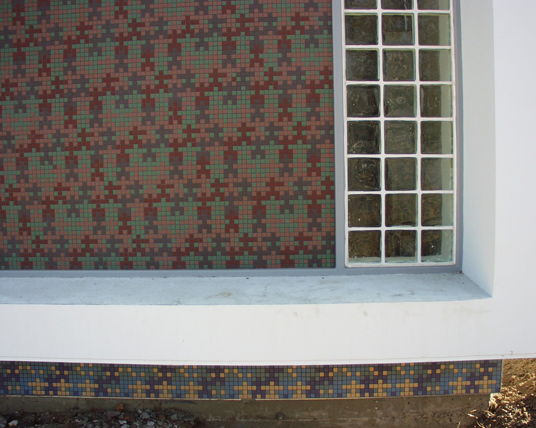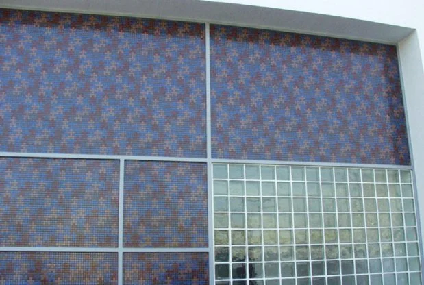 Nine murals of different colored patterns utilizing the same geometry and motif illustrating the complexity of global diversity and the outstretched hand of friendship.