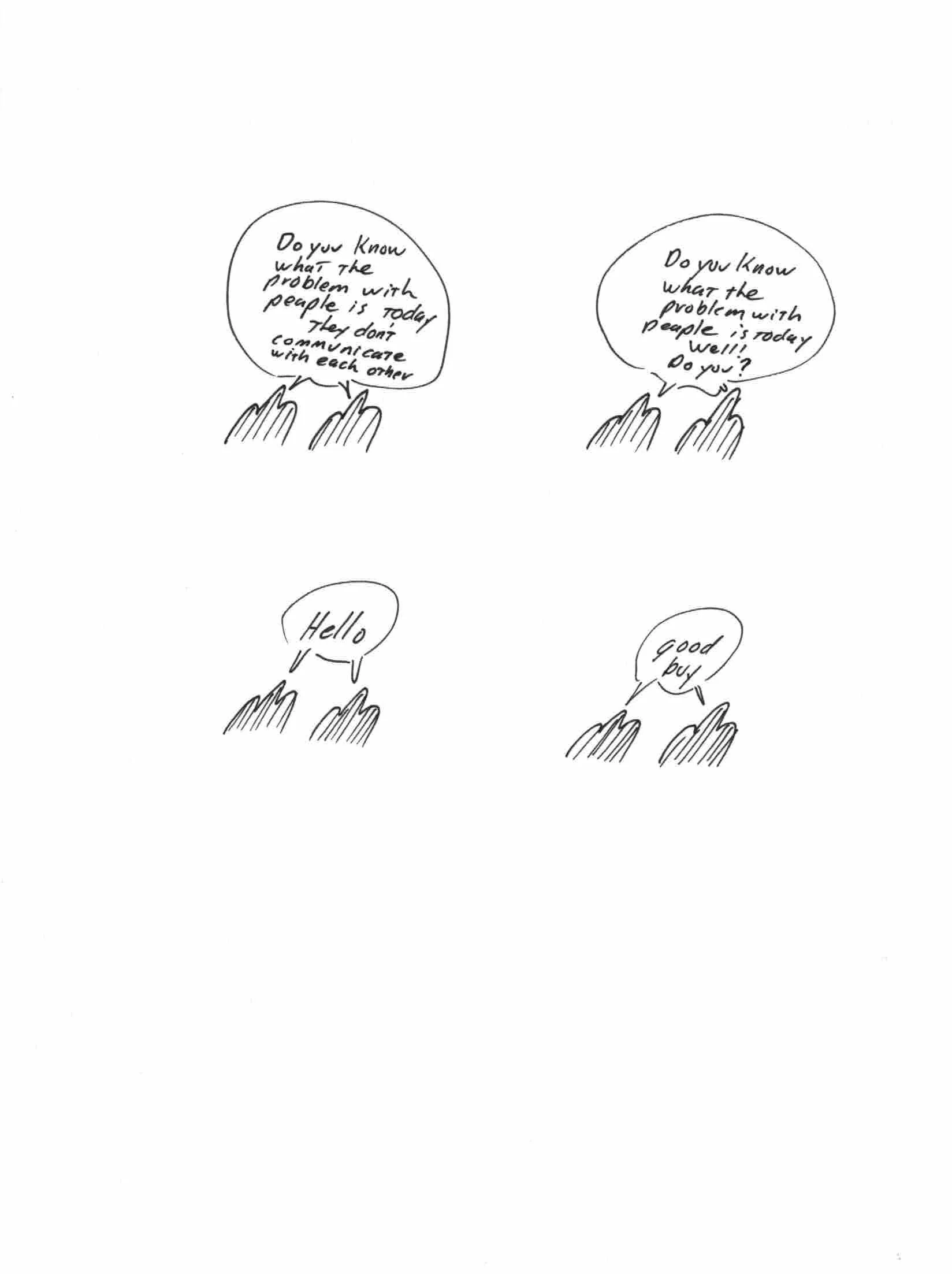 The Sketzo Series is a cartoon series, ink on paper, pivoting around two fictional characters who say the same thing at the same time, and are linked because of this strange reality, with no explanation. Title comes from the Greek word for “drawing” and “schizophrenia”.