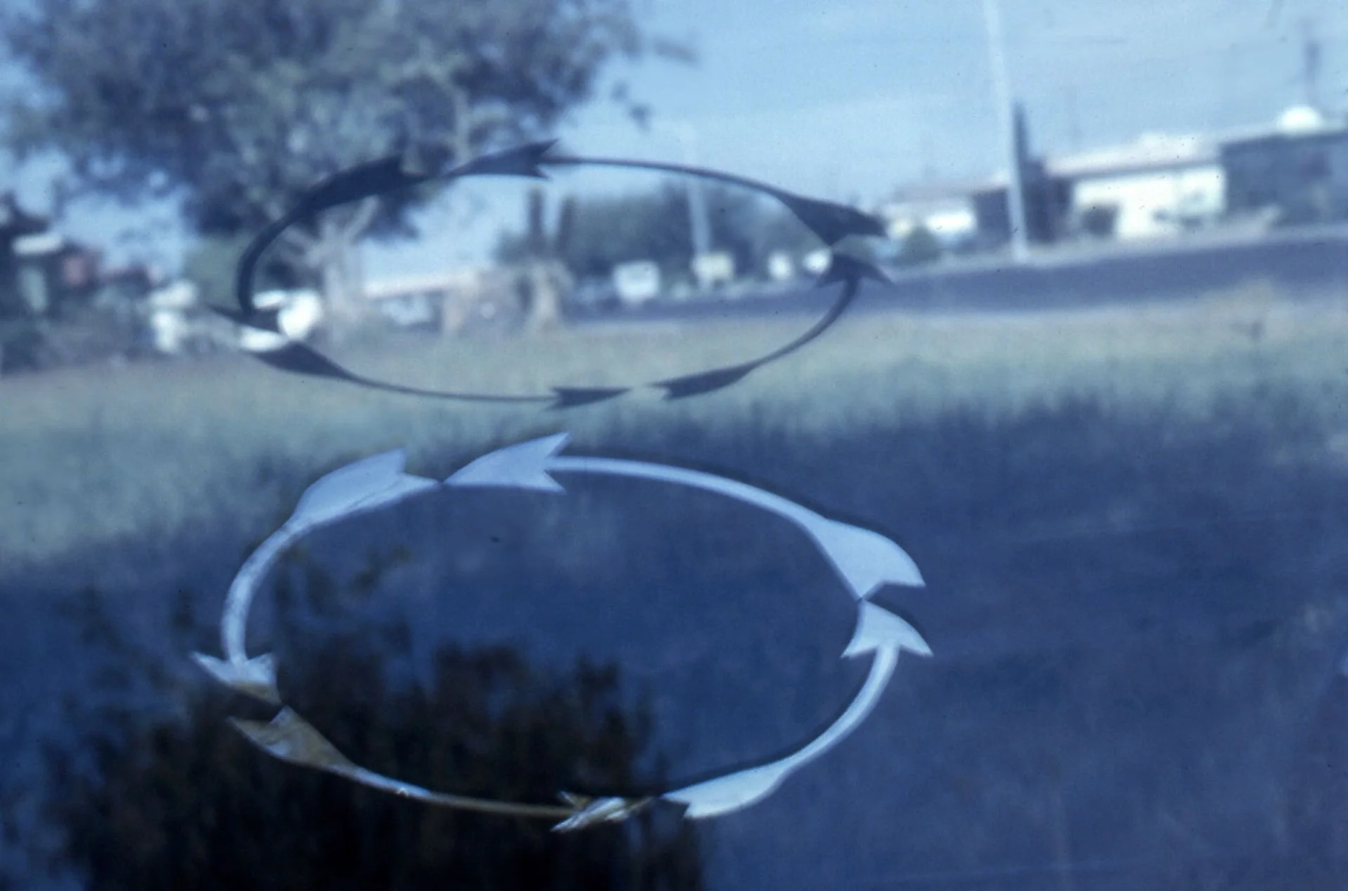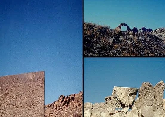 Installation documentation of geometric, mirrored elements, super-imposed in organic environments.