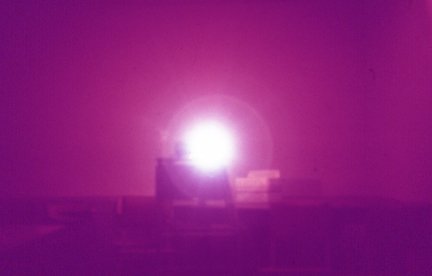 A 35mm projection installation showing an interactive, live projection on a mirror screen reflecting the contents of the room, including the viewers. Colors dissolve on the screen, colorizing the room’s contents.