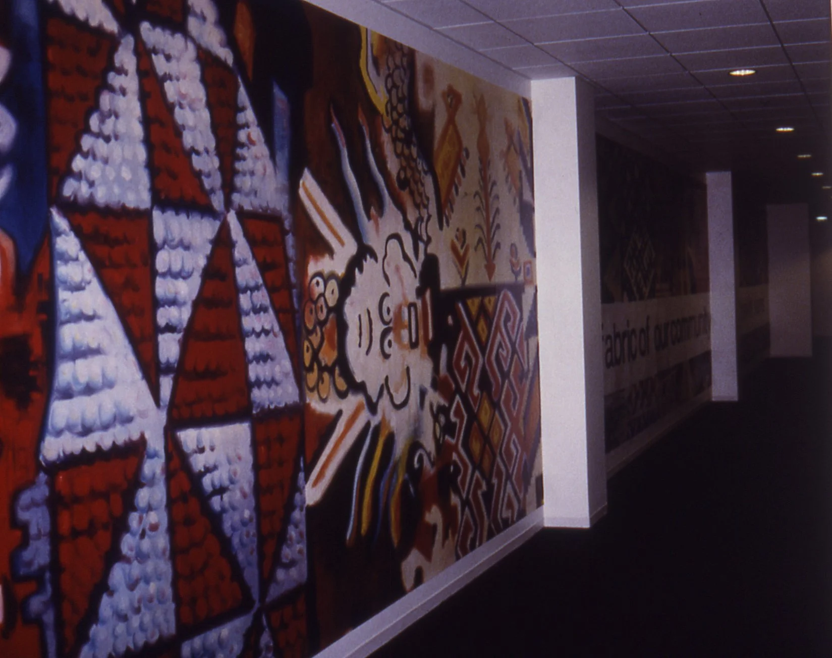 An illustration of 22 different nationalities’ graphic fabric patterns, blended together in a large-scale patchwork motif to illustrate its accompanying slogan, "the fabric of our community is closer than its seams."