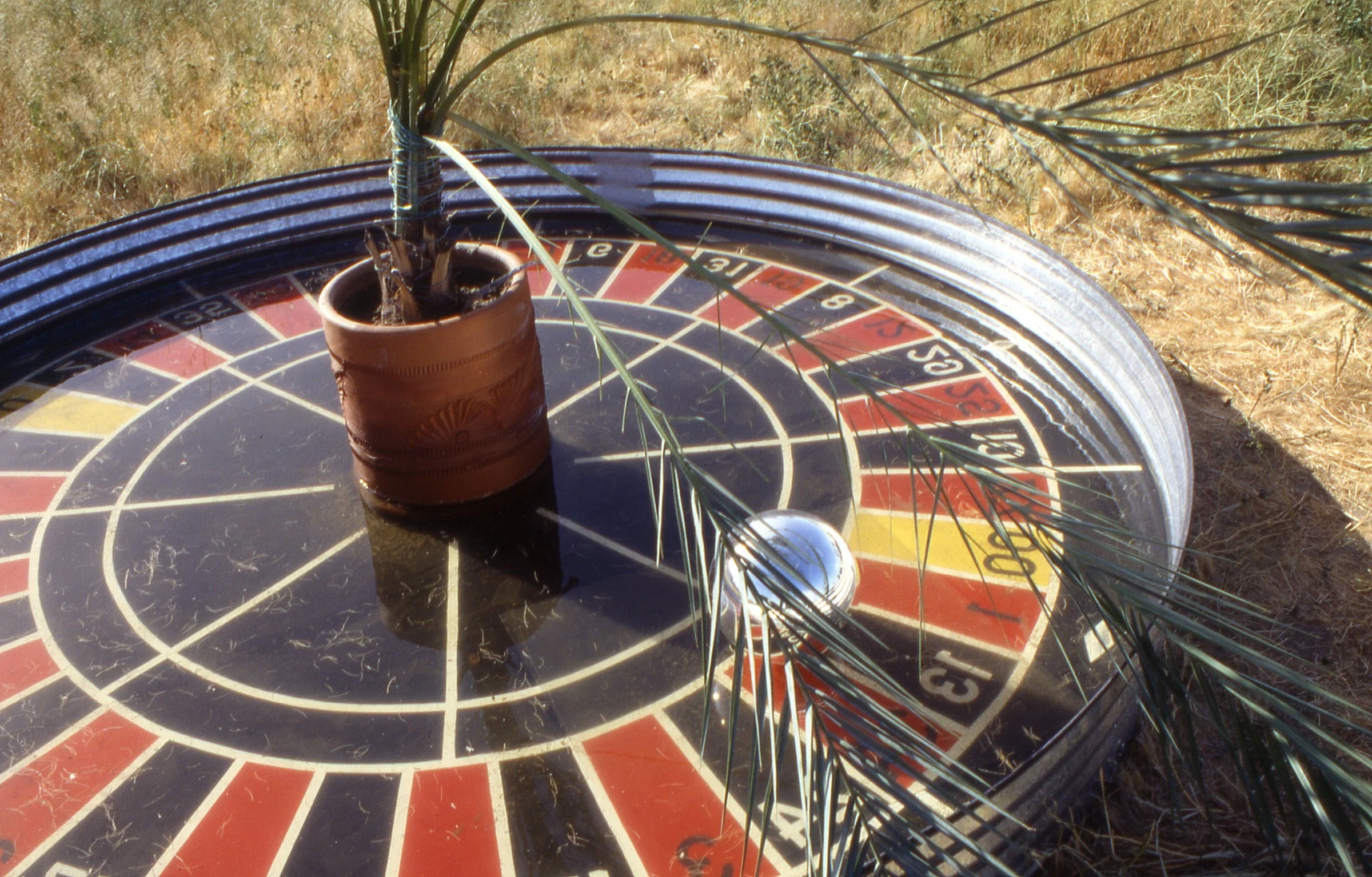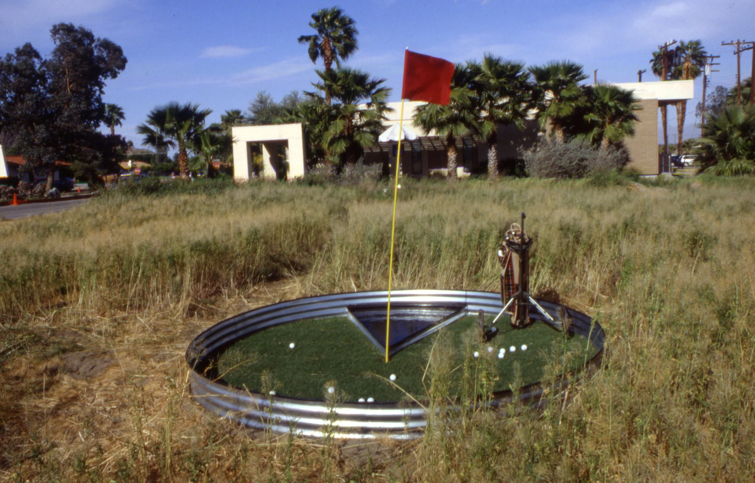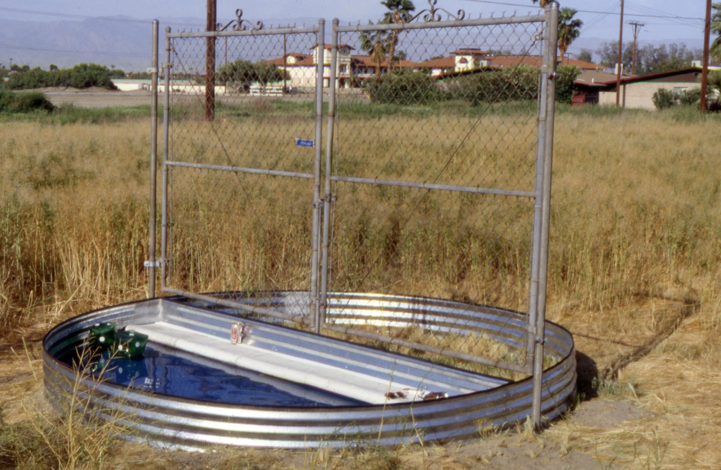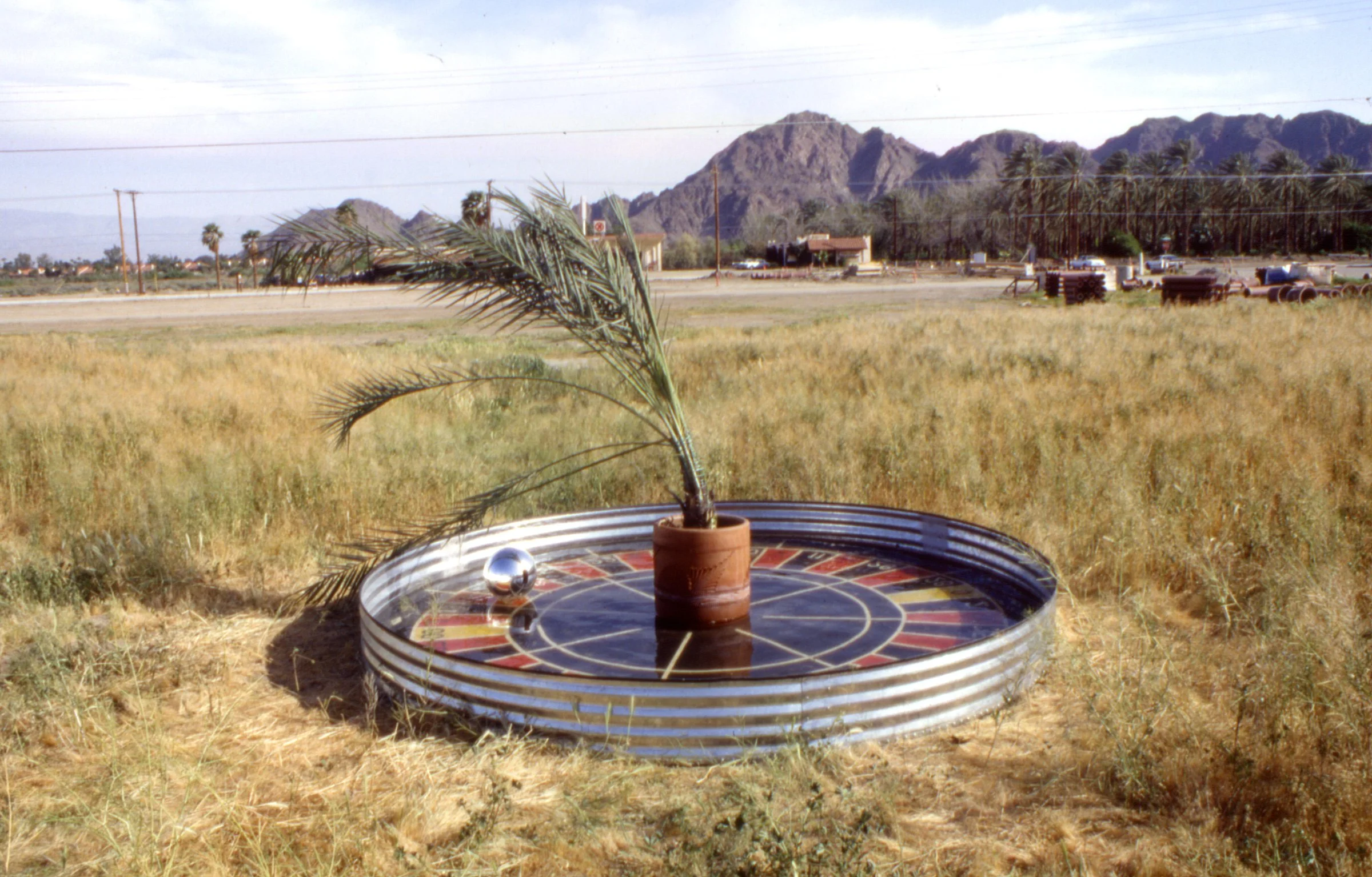 "Following his belief that art for public spaces should be site-specific and interactive with its environment, Tzanetopoulos has created a three-week installation based upon research about the area, visits to commercial and historic sites and his conversations with local residents. In creating "WHAT? if", Paul Tzanetopoulos focuses upon water as the basis for all life in the desert, affording us an opportunity to reflect upon ourselves in our own space, to see ourselves amidst our surroundings, our past and present. "WHAT? if" introduces questions about our community: not only about what has gone by, but to put us in context and to consider the future. The constantly rotating comments (on the message unit) are thoughts suggesting a semantically cyclical condition relating to the past and present. These thoughts were elicited from the community about the community, juxtaposed with some challenging and humorous statements to reflect upon. The slogan in the first pool allows us to reflect our actual position in the art piece and the community. At the putting green, we are invited to experience one of the community's largest industries. We not only see ourselves reflected in the ring, but notice how dependent the resort industry is on water allocation and the pressures that this places on the environment. In the third pool, a modern paradise collides with the Cahuilla perception that our valley was their paradise, their "Garden of Eden". A fence separates the swimming paradise from the other half: a segment of the desert with Cahuilla relics long since missing from this environment. Lastly, the roulette motif alludes to a larger literal element of gambling, as well as the historic element of gambling on agriculture (and other ventures) in this valley. The contemporary issue of gambling is posed as a current question to reflect upon. The public is welcome to interact with each piece, to putt, gamble, reflect, wade and wonder.....WHAT? if".