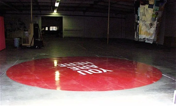 A large-scale ‘You Are Here’ locator dot laminated to gallery concrete floor. An interactive piece, viewers were invited to stand within the perimeter of the dot. The red locator dot metaphorically alluded to a plea for awareness of one’s position(s), ranging from a place location to a spiritual stance.