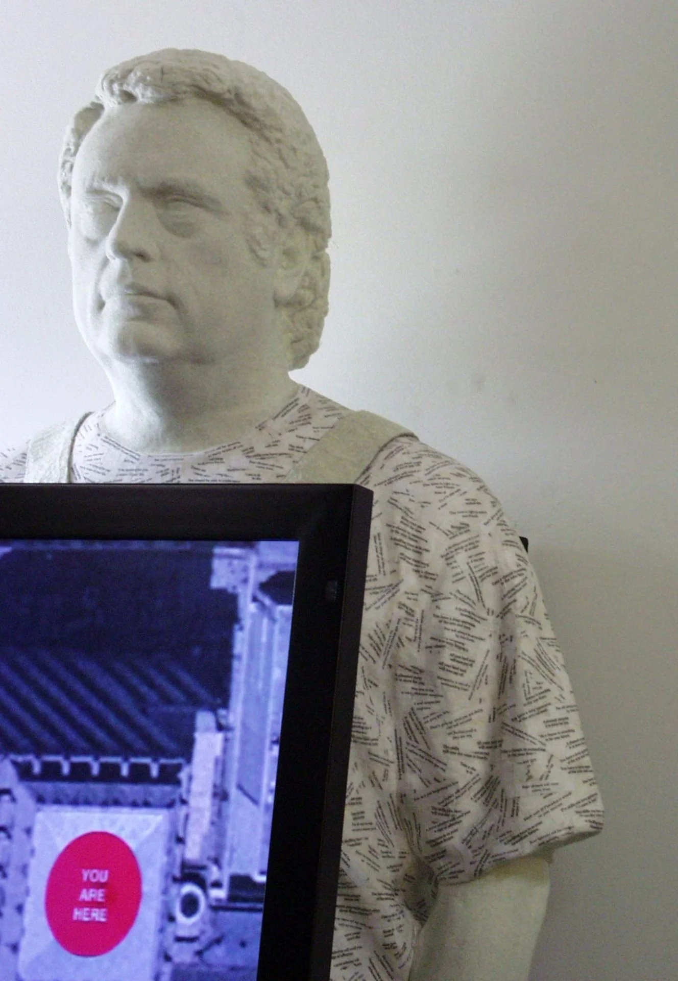 Life-size statue, 26” LCD flat screen, DV drive, latex, paper, gel medium, sculpt foam, glass beads and mixed media