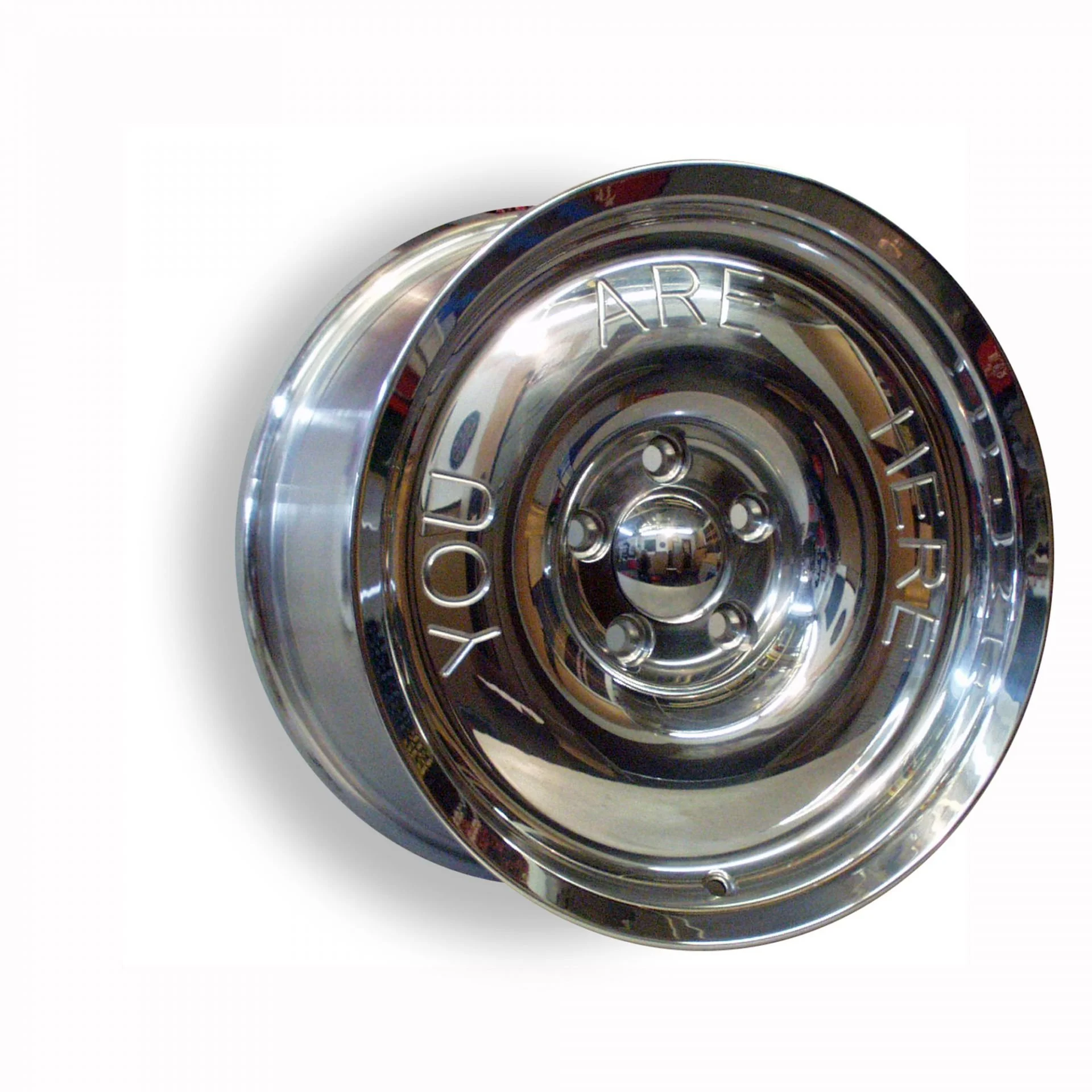 The Carnage Series deals with our car culture’s preoccupation with the vehicular status symbol. In most cases, the wheels are as important as the vehicle. The social pressures for keeping up with the latest fashion-driven aspect has become a cultural phenomenon. One result is that buyers of new vehicles are warned that with a particular upgrade in their vehicle’s wheels, they run a greater risk of having their car stolen. Each region in California currently has an undercurrent of gang and criminal activity solely based on these parameters. Lives are lost, property is damaged and the culture of the gang members on the street is driven by these bizarre designed and fashion-driven realities. The Carnage Series includes wheels specifically named for some of these social issues, such as “Compton” and “Encino” inscribed on each wheel, as well as the geo-social impact of the wheel and the car on our planet via the green wheels and the “You Are Here” markers.